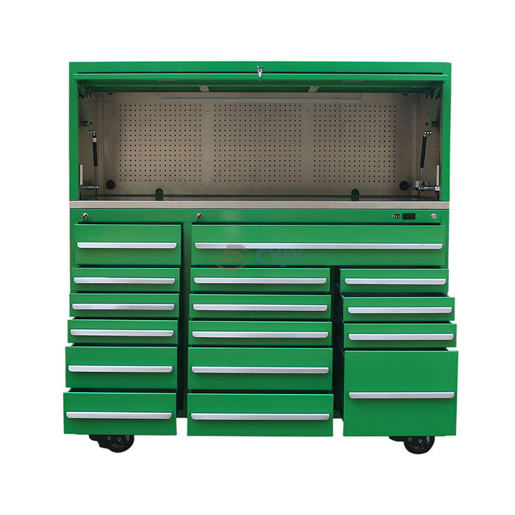72 इंच स्टोरेज टूल कॅबिनेट त्याच्या प्रचंड क्षमतेसाठी आणि उत्कृष्ट कार्यांसाठी प्रसिद्ध आहे. टिकाऊ स्टीलपासून बनवलेले, ते जड-कर्तव्य आहे आणि त्यात विविध साधने आणि उपकरणे आहेत. मल्टी-लेव्हल ड्रॉर्स आणि ओपन स्टोरेज क्षेत्रे लवचिक स्टोरेज पर्याय प्रदान करतात, ज्यामुळे तुम्हाला साधने सहजपणे व्यवस्थापित आणि वर्गीकृत करता येतात. प्रत्येक ड्रॉवर टॉप-ऑफ-द-लाइन स्लाइड सिस्टमसह सुसज्ज आहे, जे गुळगुळीत आणि शांतपणे उघडणे आणि बंद करणे सुनिश्चित करते.