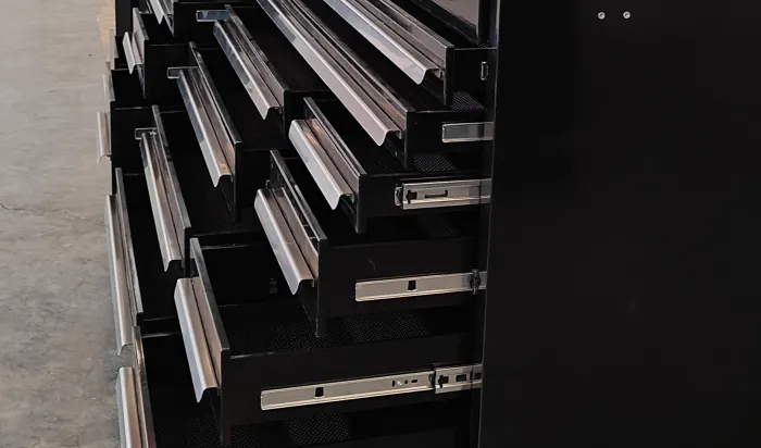 मूक स्लाइड रेलः काळ्या मल्टी-फंक्शनल टूल कॅबिनेटमध्ये हेवी-ड्युटी मूक स्लाइड रेल आहे, ज्यात गुळगुळीत खेचण्याची क्रिया आणि मजबूत लोड बेअरिंग क्षमता आहे.