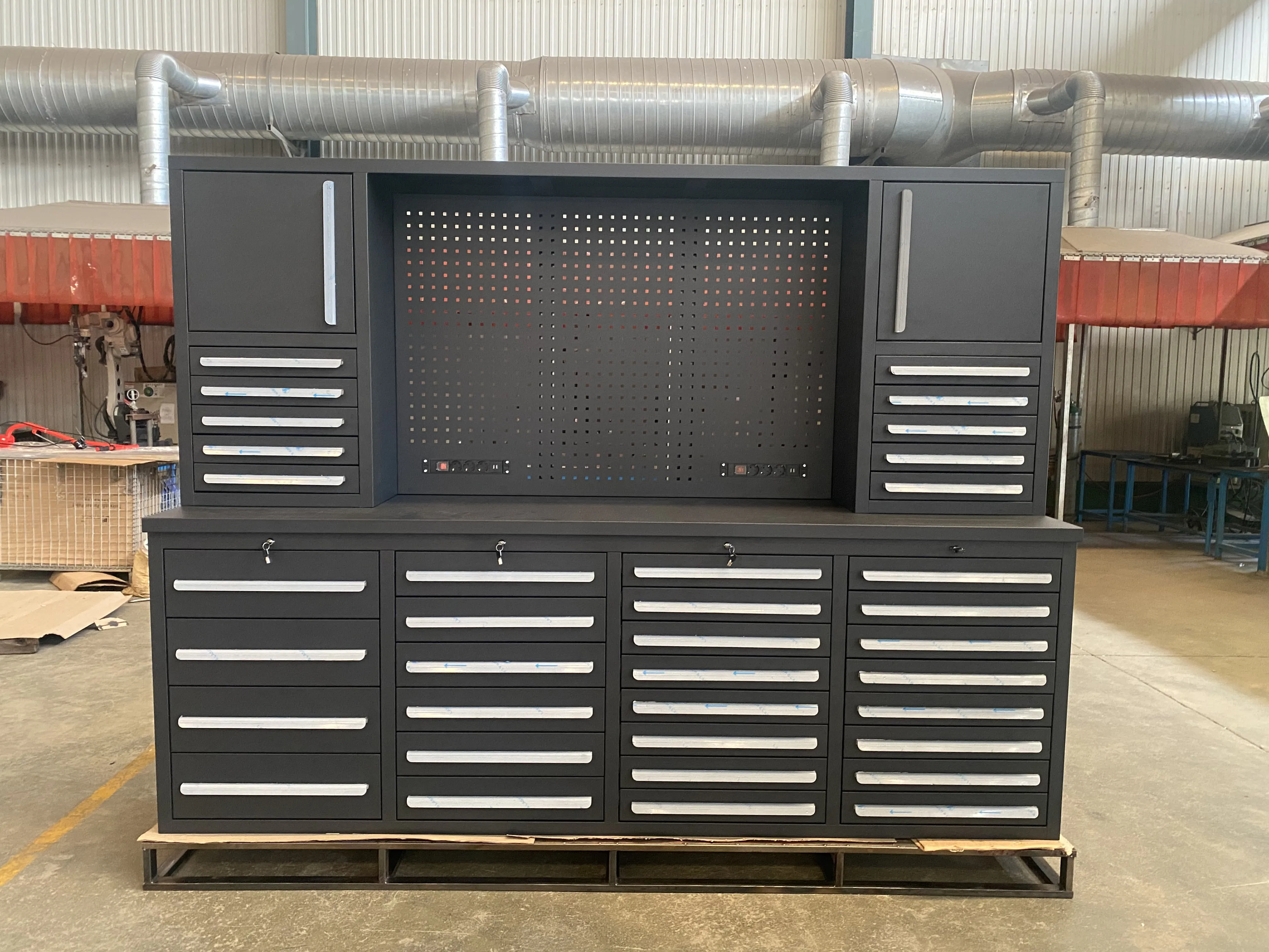 हे टूल कॅबिनेट उच्च-गुणवत्तेच्या कोल्ड-रोल्ड स्टील प्लेट्सपासून बनविलेले आहेत, ज्यामुळे दृढता आणि स्थिरता सुनिश्चित होते. ड्रॉवर गॅल्वनाइज्ड स्टील प्लेट्समधून तयार केले जातात, उत्कृष्ट अँटी-कॉरोशन आणि अँटी-रस्ट गुणधर्म प्रदान करतात. आत, 36 ड्रॉर्स आहेत, साधने आणि वेगवेगळ्या आकारांच्या भागांसाठी पुरेशी स्टोरेज स्पेस ऑफर करतात.