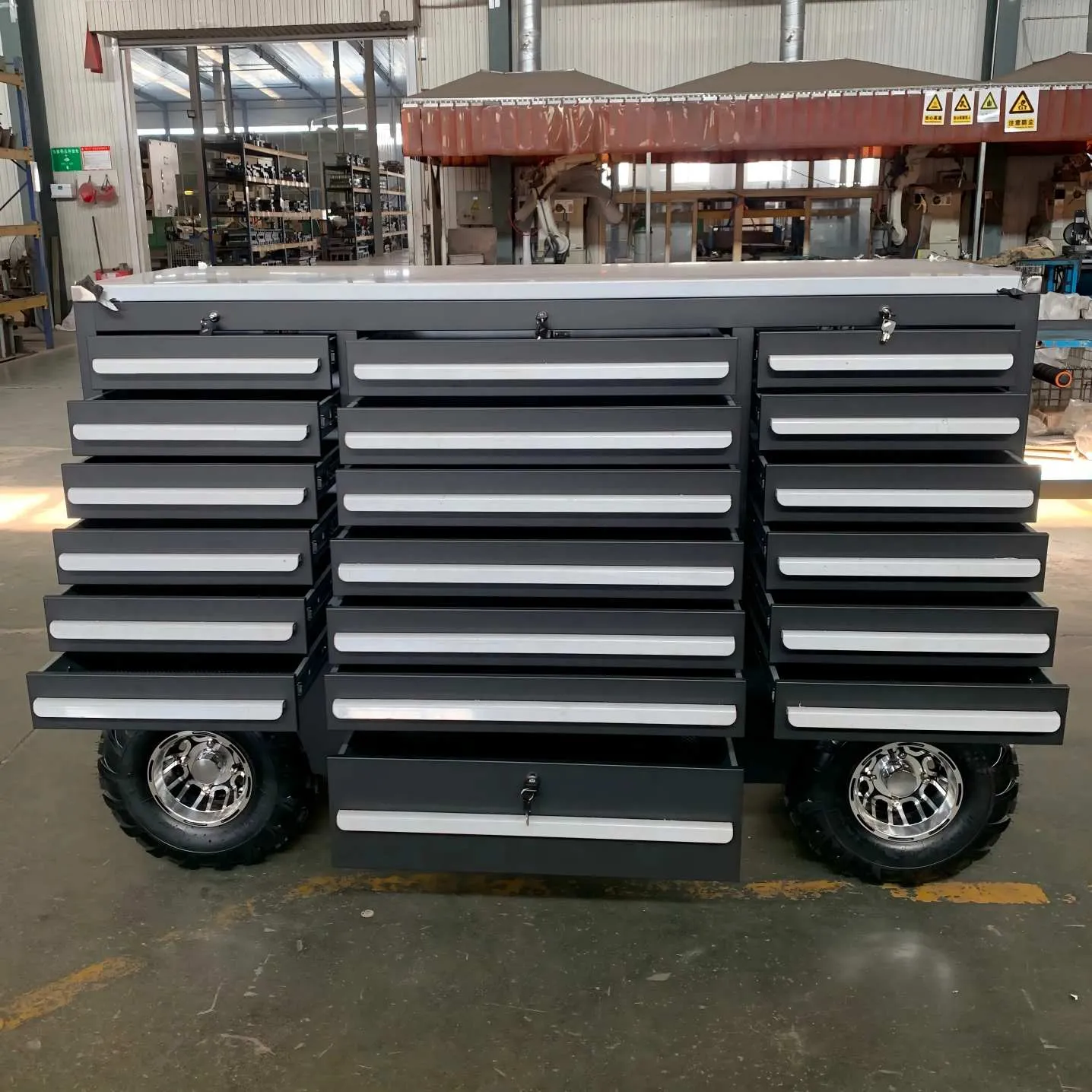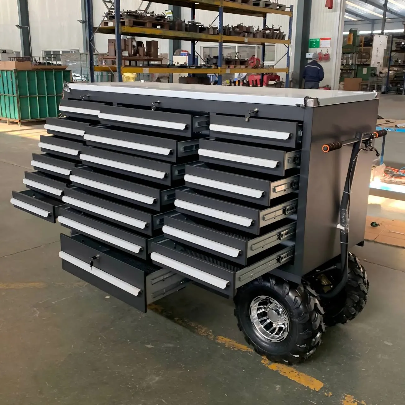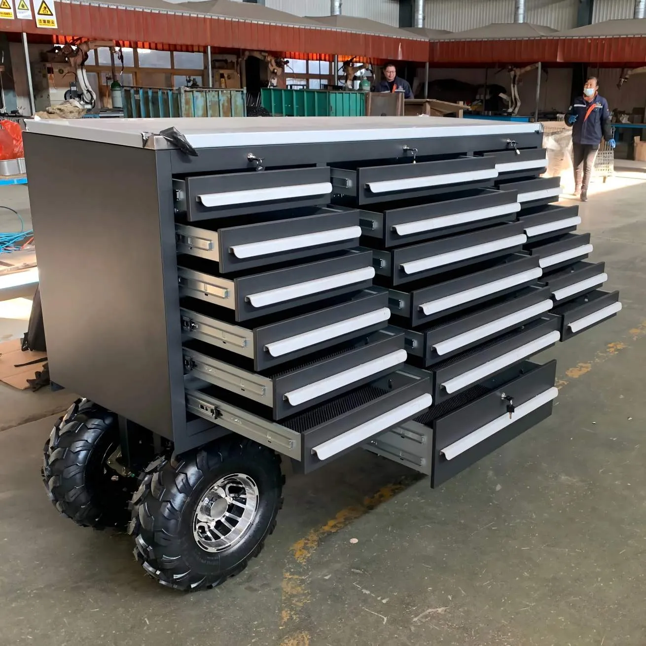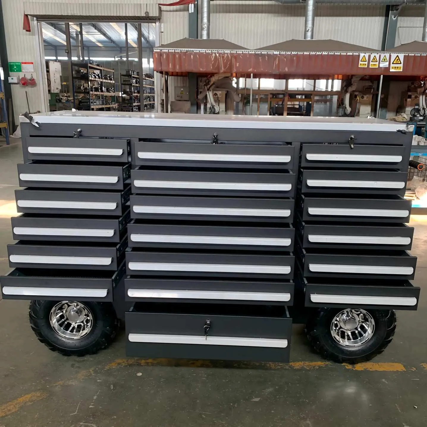 सुरक्षा आणि विश्वासार्हता: साधन सुरक्षा सुनिश्चित करण्यासाठी आणि तोटा किंवा अनधिकृत वापर रोखण्यासाठी ड्रॉर्स लॉकसह सुसज्ज आहेत. आतमध्ये अँटी-स्लिप पॅड डिझाइन साधने पडण्यापासून आणि हालचाली दरम्यान खराब होण्यापासून टाळते.